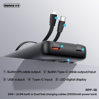 پاوربانک ریمکس مدل RPP-38 با ظرفیت ۲۰٬۰۰۰ میلیآمپر ساعت و توان خروجی ۲۲٫۵ وات، یک همراه ایدهآل برای تأمین انرژی