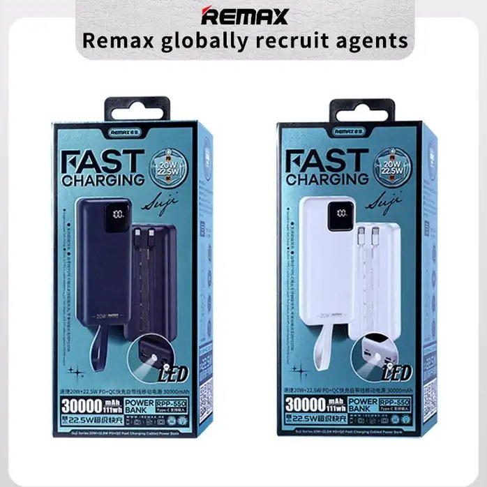 پاوربانک ریمکس مدل RPP-550 با ظرفیت ۳۰٬۰۰۰ میلی‌آمپر ساعت و توان خروجی ۲۲٫۵ وات، یک همراه ایده‌آل برای تأمین انرژی دستگاه‌های الکترونیکی شما در هر زمان و مکان است.